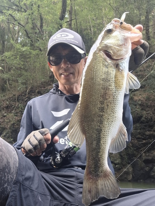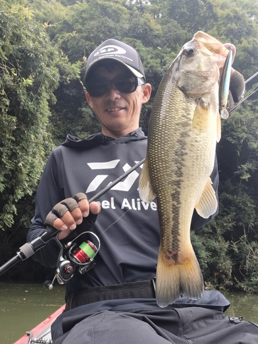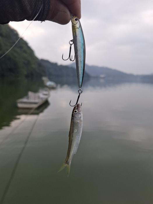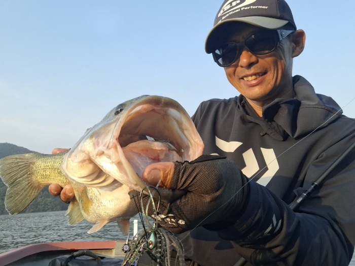 朝のうちは、小型のハスらしきベイトを補食するボイルもかなりの頻度で見かけて、ドゥルガやHPシャッドテール2.5のヴェスパ1.3gでスイミングさせるだけでかなりイージーにバイト。 レギュラーサイズ中心ですが、40弱までは混じる釣り方でこれはこれで有りな感じ。