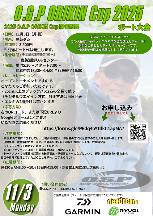そして、初の試みで11月3日にオリキンカップを開催します。 場所は豊英湖。