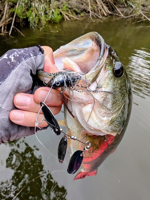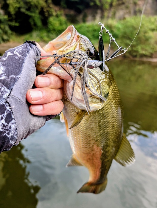 経験上スピナーベイトが効きそう! シビアさを増す状況でも反射的に反応させられることに加え、秋っぽい雰囲気になっていたこともあり。