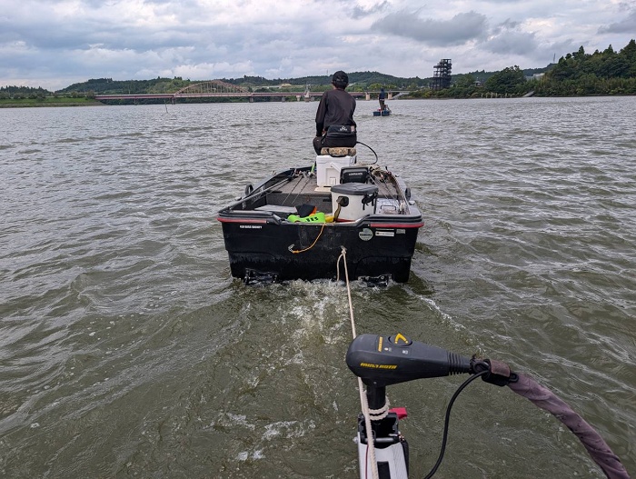 一匹目はキロくらいかな!? さらに上がっていくと、橋のたもとでエレキを上げないと進めない水深に。