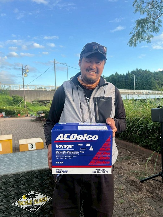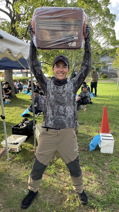 そしてまさかのタックルボックスをいただいてしまい、フィールドスタッフの梅田大地はバッテリーをGET! 競技中は熱くなり、終わってからもお楽しみ。