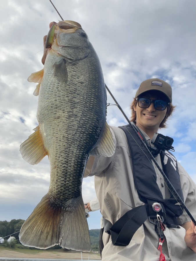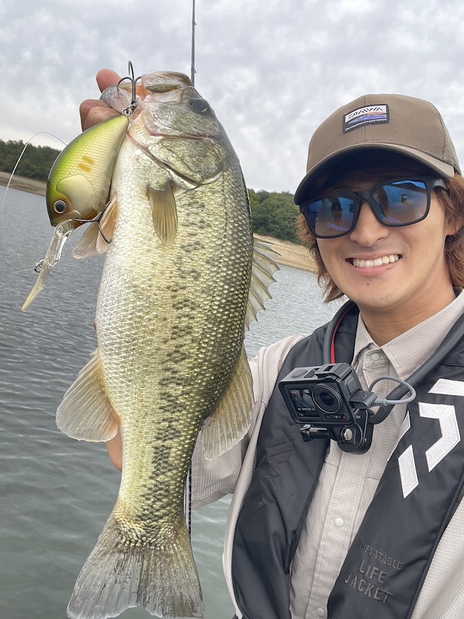 ワカサギがかなり水面でモワモワしていて、モワモワが密集している場所の下にバスも溜まっている感触でした。とにかくそういった場所を巻き倒すとバイトしてくる感じ。スティーズクランク500はマグナムクランクに近いくらいビッグなクランクベイトですが、それが逆に効いている感じでインパクトで食わせるイメージ。