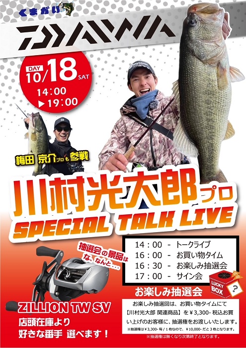 10/18(土)14:00より、くまがい釣具店にて、ウメキョー(梅田京介)とのトークライブを開催させていただきます! 質問など、お気軽にお声かけいただけたらと思います(^^)