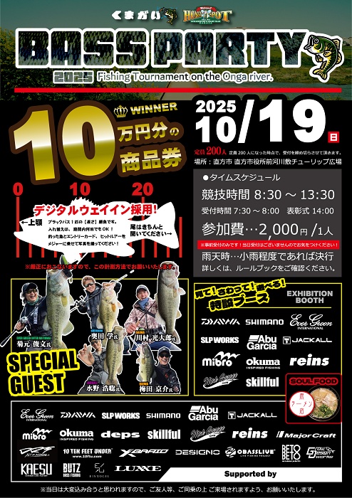 翌日の10/19(日)は、遠賀川で開催されるオカッパリ大会『ONGA BASS PARTY』にお伺いします。 ゲストは他にも、菊元俊文さん・奥田学さん・千藤顕さん・水野浩聡さん・梅田京介さんと、これだけのメンツが揃うことは稀でしょう!