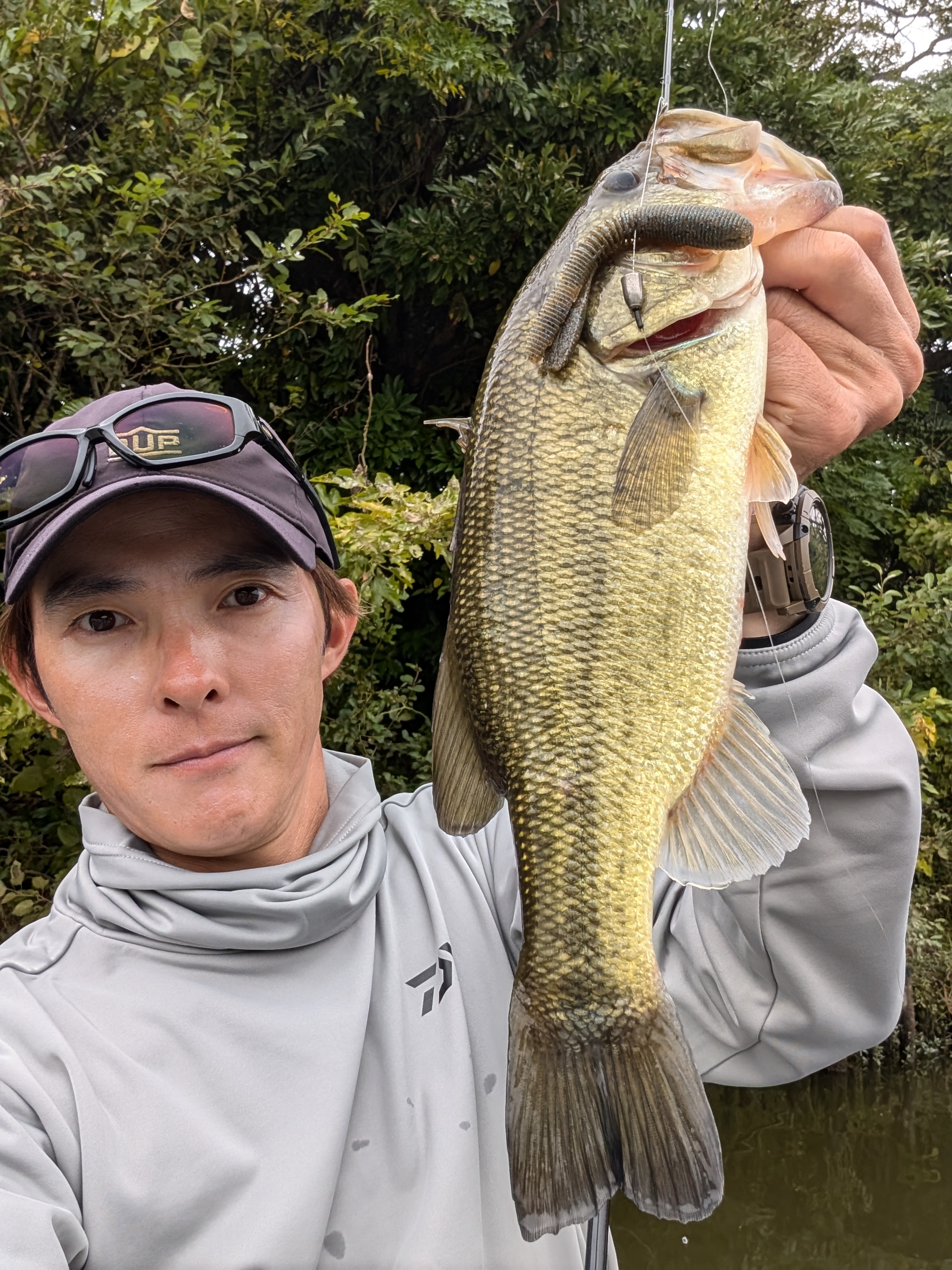 クネリーのテキサスリグは、フィールドスタッフの佐藤健一郎が良く釣れると教えてくれたメソッド。