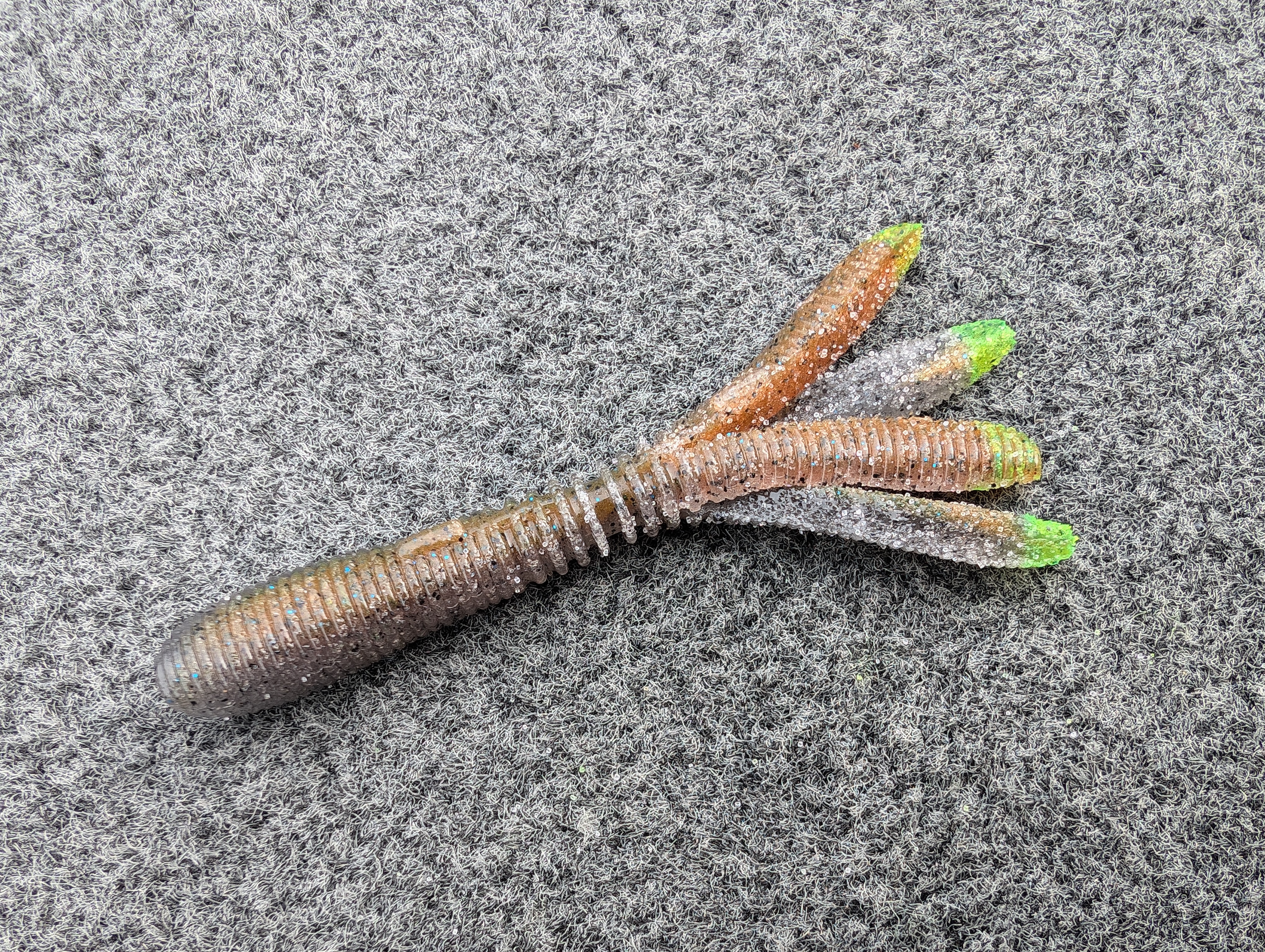 ならば、着底したときにフレアしたらどうだろ!?なんて、テールを4つに割いてみたら1匹キャッチ! でも、翌日に会社の水槽でアクション確認したらフォール中にクネらなくなっていて、そのままの方がいいかな、と。