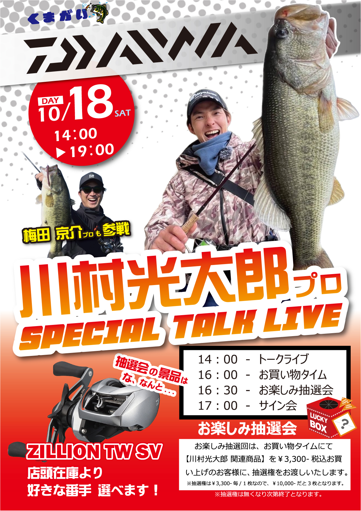 10/18(土)は、くまがい釣具さんにてウメキョー(梅田京介)とトークライブ。