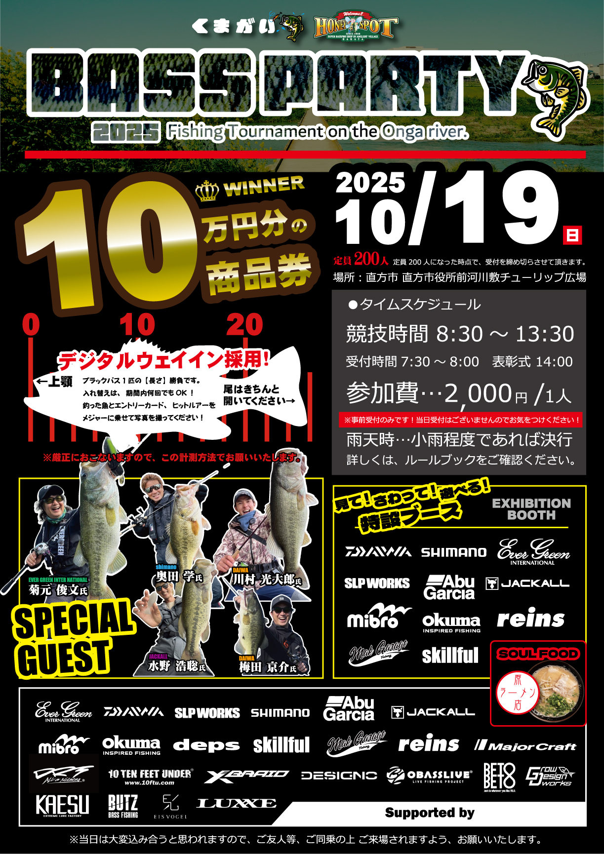 10/19(日)は、遠賀川にて『ONGA BASS PARTY』オカッパリ大会のみならず、メーカーブースの出展やゲストアングラーによるトークショーなど。