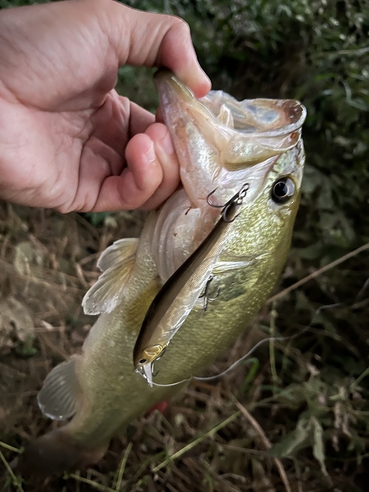 スクーパーフロッグのダウンショットリグを投じるとプイッと見切られてしまったので、腰についていたフランジャー(ボトムアップから近日発売予定)を少し遠目に投げてジャークしてくると、ひるがえってパクリ!