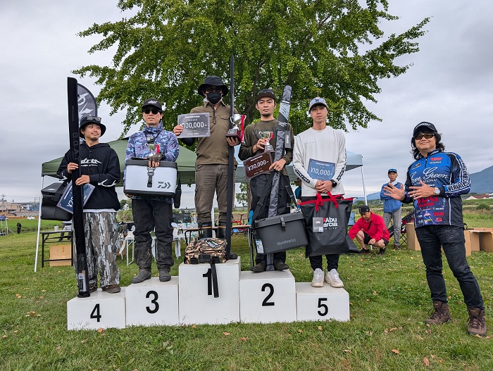 5位は45cmと跳ね上がり、4位が46cm、3位と2位が47cmと刻まれ・・・優勝はボクが目撃した49cmを釣った藤本貴志さん! ライアミノーのジグヘッドリグによるミドストで食わせたそうです。