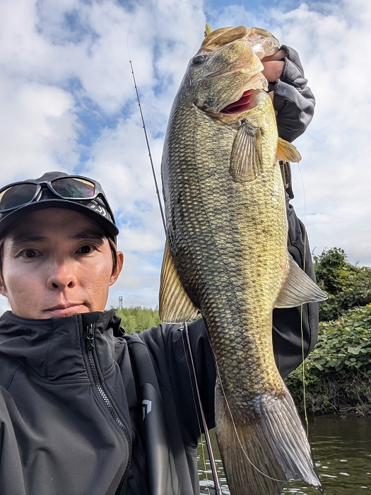 で、「この会場の周りでも釣れてますよ」と。この辺りは浅くて流れも速いためもうバスは抜けていると思っていただけに意外でした。