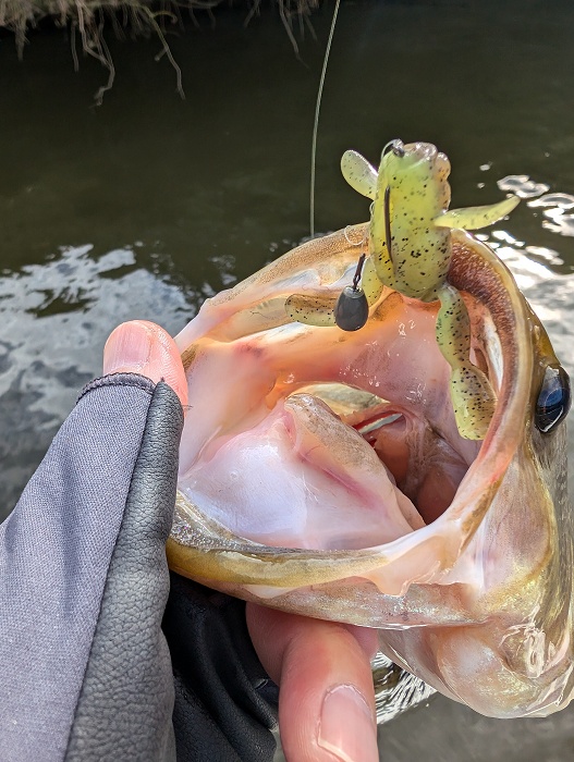 ブレーバーⅡにスレたのかバイトが途絶えたので、クネリーのフリーリグにすると1投目から釣れるも入れ換えならず。 バイト続かず、クネリーをノーシンカーにするとまた1投目に釣れるも、小さい・・・