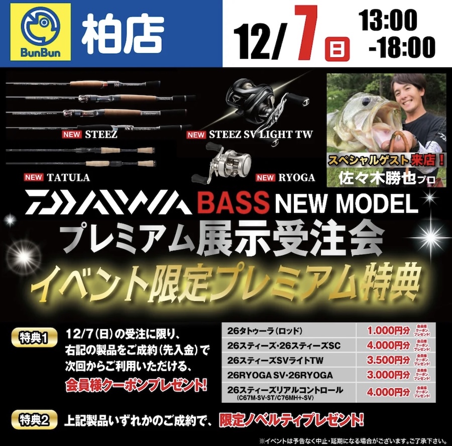 12/7(土)は千葉県のブンブン柏店さんにて同様に未発売のタックルの展示受注会が行われます。僕もお邪魔させて頂きますので、STEEZ SC S69UL含め、気になる新作ロッドやリール等ありましたら、ぜひお越しください!!
