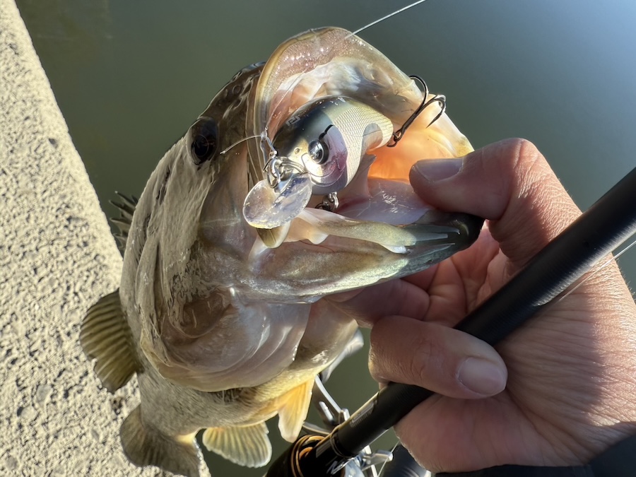 SKMはMAX1.5mまでがターゲットレンジで、ロッドの角度等で1m以内も気持ち良く巻けて、倉敷川と相性抜群。ウィードもスルスル抜けてくれるし…突っ込ませても外れてくれて…もう言うこと無しのシャッドクランクです。低水温期の新しい一手になりつつあります。