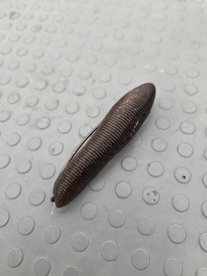 マイラーミノーのワンド釣法。スピンナッツ80などを使ったボトムズル引きパターンや、HPシャッドテール2.5ダウンショットなどは丁寧にやりきれば、ライブソナー関係なく有効です。