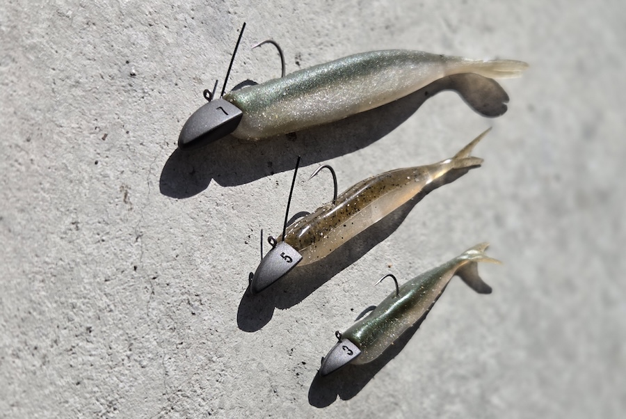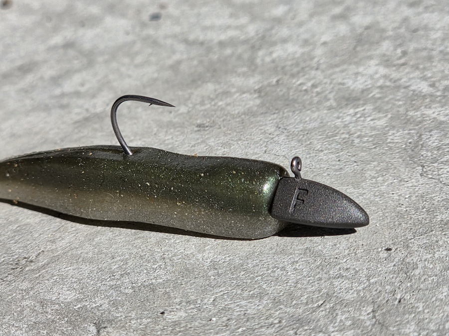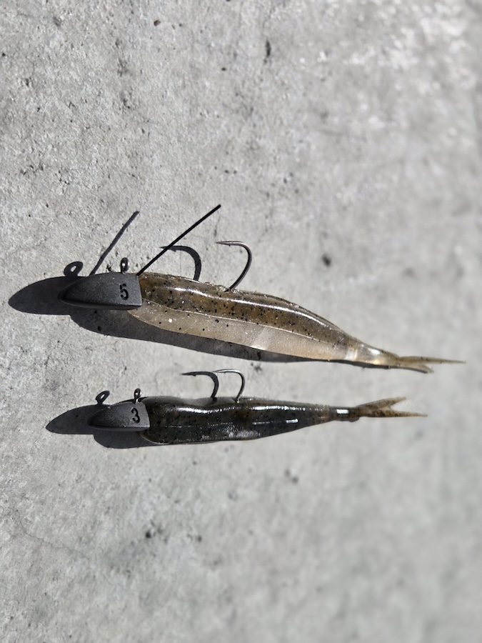 ワインドテクニックで使用。安定して左右への鋭いダートアクションもさせやすく、フックのバランス、違和感のないシルエットなので色々な使い方ができます。そして何よりイケてるのは、信頼できるRYUGIフックであるというところと、ワイヤーガードが標準装備というところ。フックサイズも2展開で、3インチクラスのワームから5インチクラスのワームまで使えます。