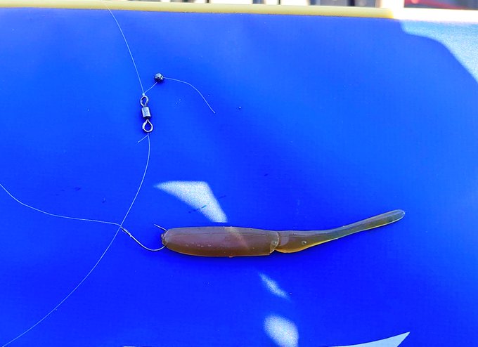 キモは先端に薄さしすること。 小さめのワームは逃がした時のしなやかさを活かせるように、通し差ししないほうが基本的には良いというのが私の考えです。