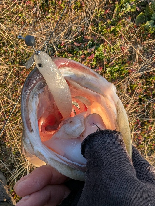 リグは全てヴァラップミノー5インチのジグヘッドリグで、1.8gと3.5gをレンジによって使い分け。 バスにルアーを見つけさせる段階ではしっかりロールさせ、反応して距離が詰まってきたら尻尾を震わせる程度の繊細なシェイクに切り替えて食わせたそうです。 また、ジグヘッドにはフリーノットで結び、ロールアクションを出やすくしていましたね。