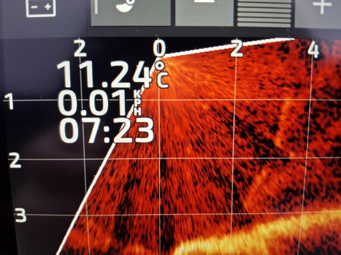 水温11℃超。これだけ見てもテンションMAXです。 色々な場所で釣れそうなイメージで目移りしますが、とりあえず上流を目指し出船。