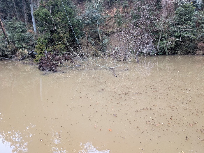 上流へ向かうと、泥濁り。 一旦は濁流になったであろう流れは弱まっているも、流れを遮るヘコミを狙っていきます。