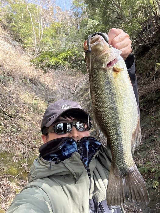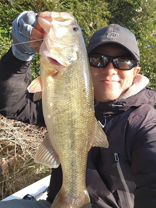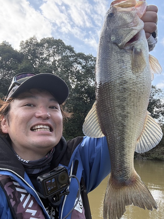 ちなみに、もう1匹の釣果は千葉陵平によるヴァラップスイマー4.2inのジグヘッドリグによるミドスト。 こちらはライブソナーを活用した釣りですが、濁りでバスがルアーに気づきにくいところ、このリグにすると反応したそうです。