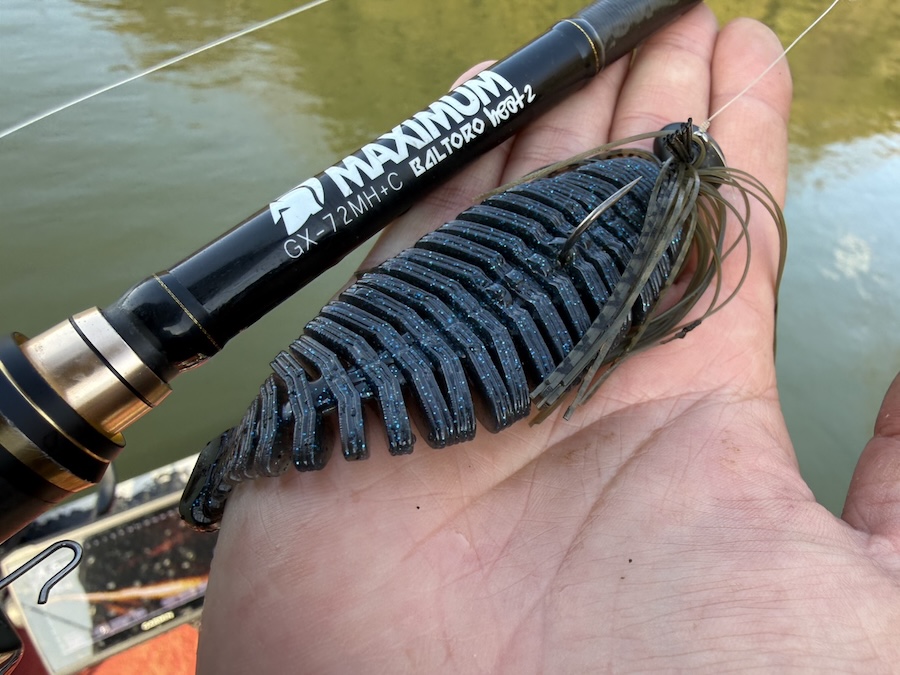 ヒットルアーはフットマスター18g+ヒラタイラー3.7inchの組み合わせ。深場を攻めたいから18gを選んだのではなく。狙いの射程レンジは3m以内でスピード感で仕掛けて、ファーストフォールのボトム着底後はストりながら回収するイメージ。