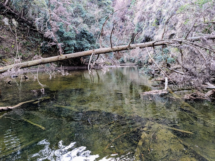 上流へ上がりつつ、雨後にスクーパーメガで釣ったクリーク奥の滝へ。
