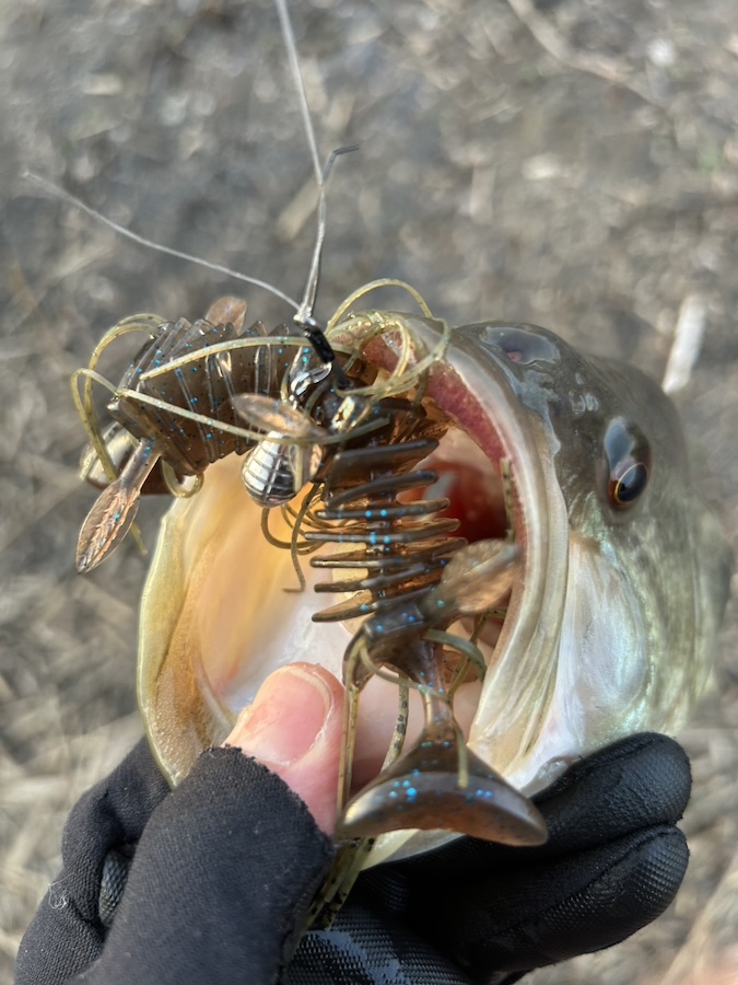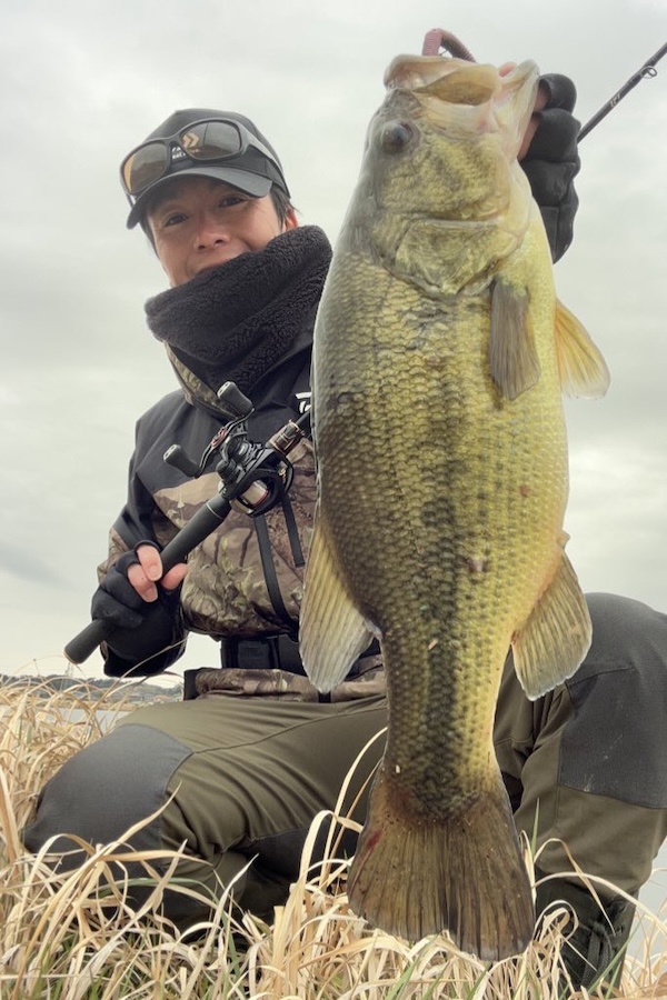 ちなみにこのカラーはミミパンブルーフレークというカラーで、春に霞ヶ浦水系のような水に色がついたフィールドで多用するカラーです! ツートンカラーのミミズ部分が赤っぽいのが釣れる秘訣で、グリパン部分との明滅もあり、有効なカラーだと考えています。
