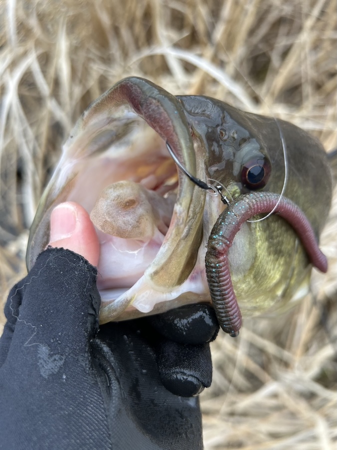 ゴミ溜まりの下にストレートワームのネコリグを入れる釣りが効いてくるタイミング。という訳でアシ際にできたゴミ溜まりに、スティーズネコストレート5インチの2.2gスナッグレスネコリグを入れ込むと…。