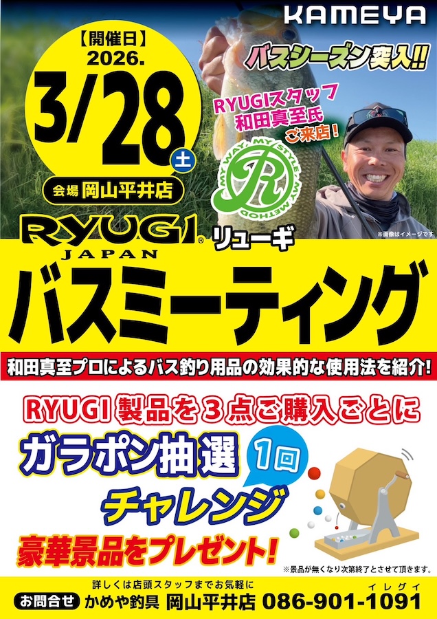 3月28日(土)にかめや釣具岡山平井店にてリューギイベント(第2回バスミーティング)を開催します。時間は11:00〜18:00。バス釣り用品の効果的な使用法だったり、フィールド状況だったり狙い方だったりなんでも気軽に声を掛けていただけたらと思います。ご都合良ければ、短時間でも遊びに来てもらえたらと思います。