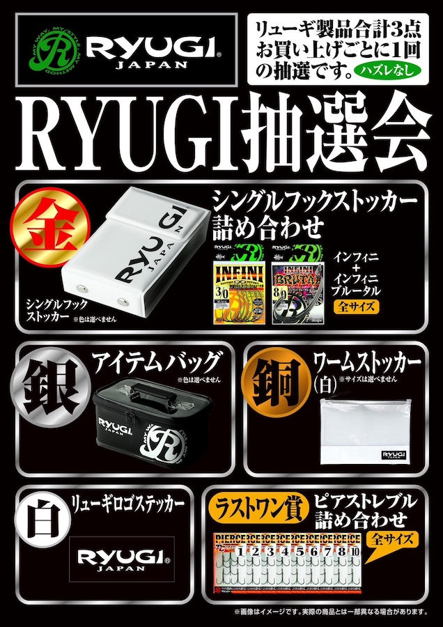 RYUGI製品を3点ご購入ごとにガラポンチャレンジができます! 豪華景品をご用意していますので、よろしくお願いします! 当日はかめや釣具岡山平井店にてお待ちしてます。