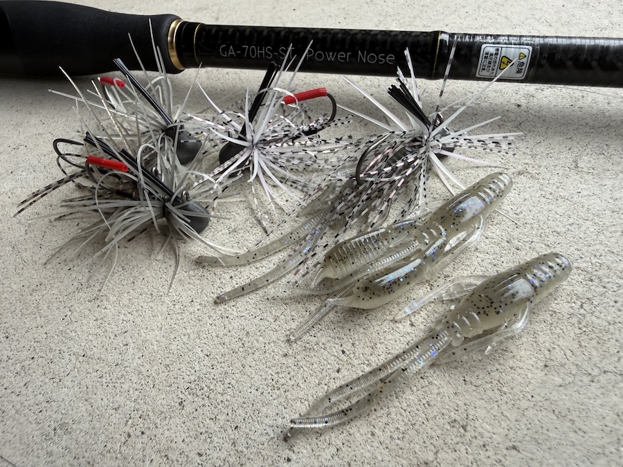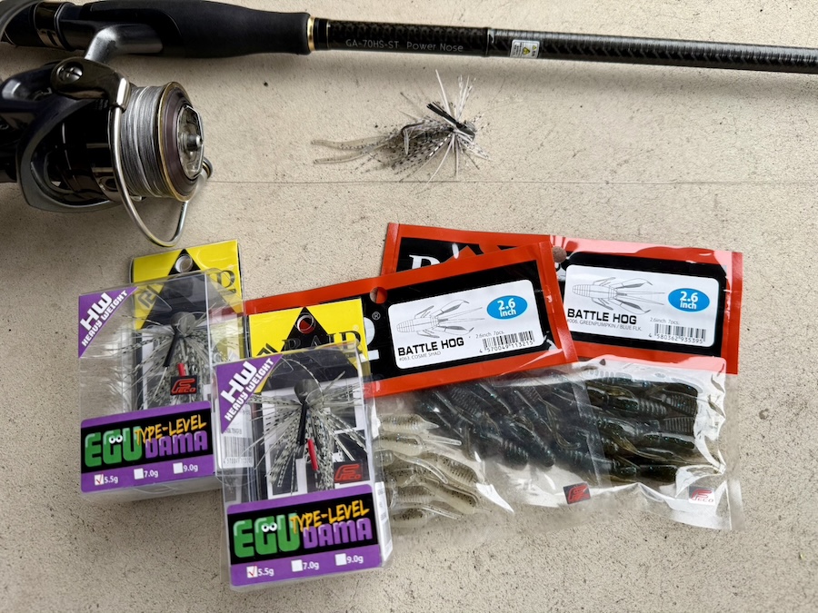 5.5g。浮きゴミやカバーへテンポ良く入れつつ、重すぎず軽すぎずの1番ドンピシャなウエイトが5.5g! トレーラーワームはバトルホッグ2.6inchの爪カット仕様がオススメ。濁りがあったりする場合はそのままでもオッケーです。