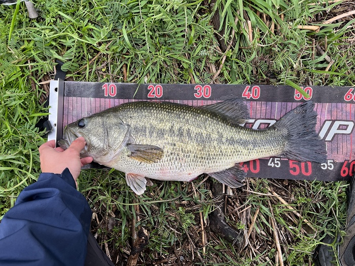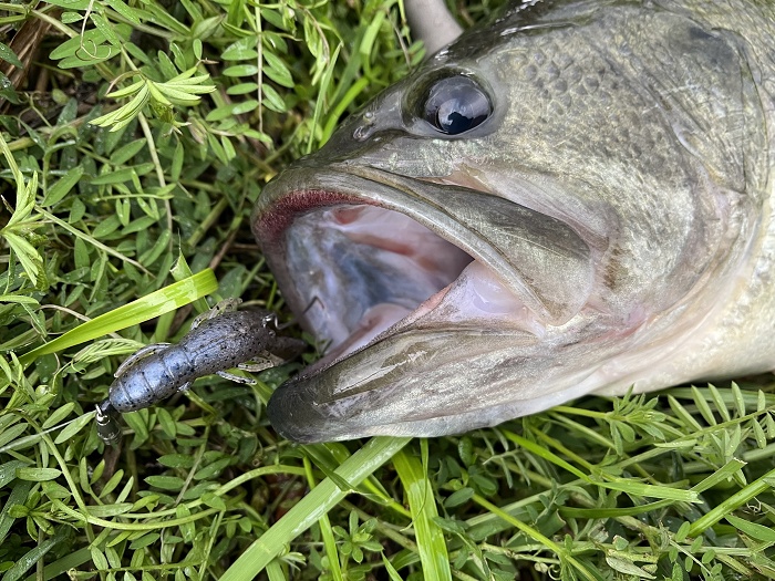 巾着に流木が引っかかっていたのでブルスホッグ3inフリーリグ(3.5g)にローテーションして丁寧に誘うと...