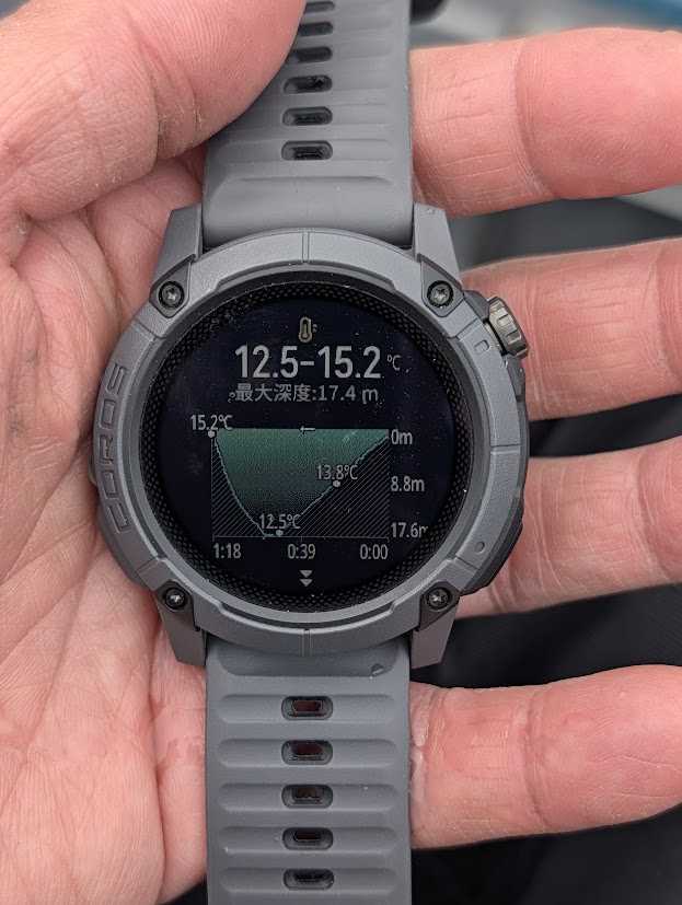 水圧センサーが水深を測定し、水温センサーで各水深の水温を計測、そのデータがスマートウォッチに送られ見ることができます。