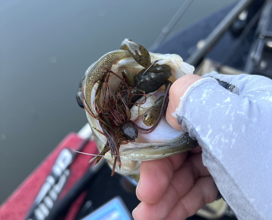 水深1.0m前後をゆっくり引いてきたかったため、スクーパーフロッグMidの逆手はカットせずスナックジグ5gに合わせました。