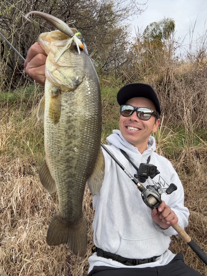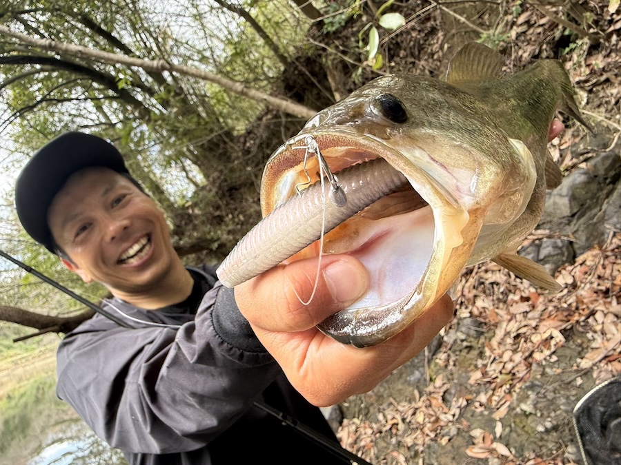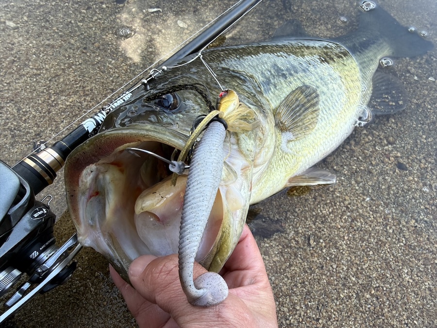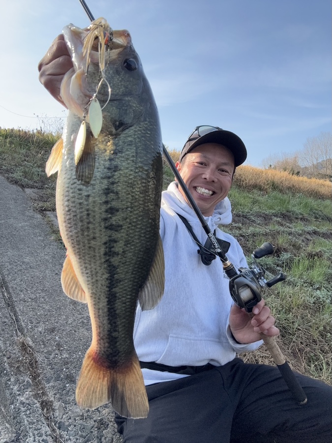 やる気スイッチオンの魚だけ狙い!ってことで、岸際を中心にシャローをガンガン巻いて釣り歩き。狙い通りの魚が居そうなスポットからぶっ飛びバイトで、いい魚を仕留めることに成功しました。