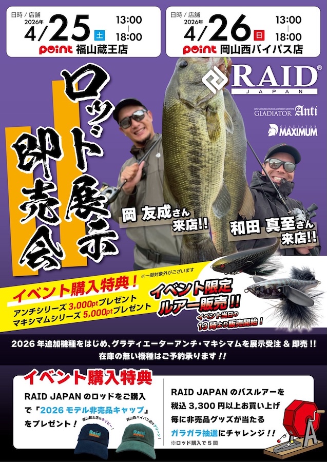 4月25日にポイント福山蔵王店、4月26日にポイント岡山西バイパス店にてロッド展示即売会を13:00〜18:00で開催します。